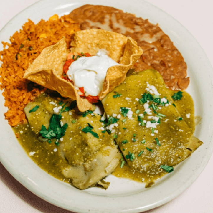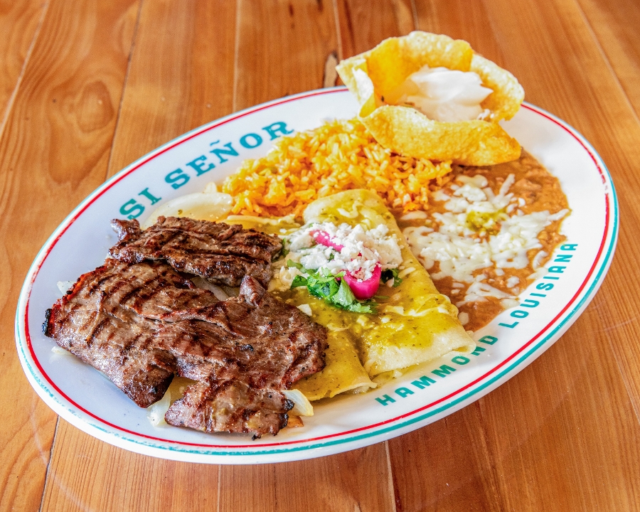 cheese enchiladas, verde sauce, rice, beans, avocado, grilled onions, carne asada