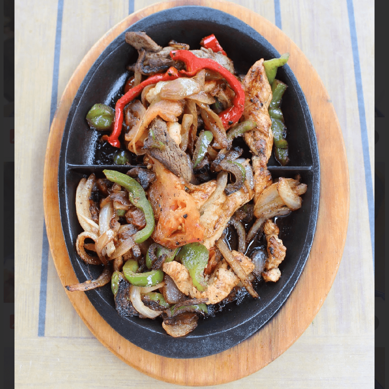 onions, peppers, and tomatoes, lettuce, guacamole, pico, sour cream, rice, beans