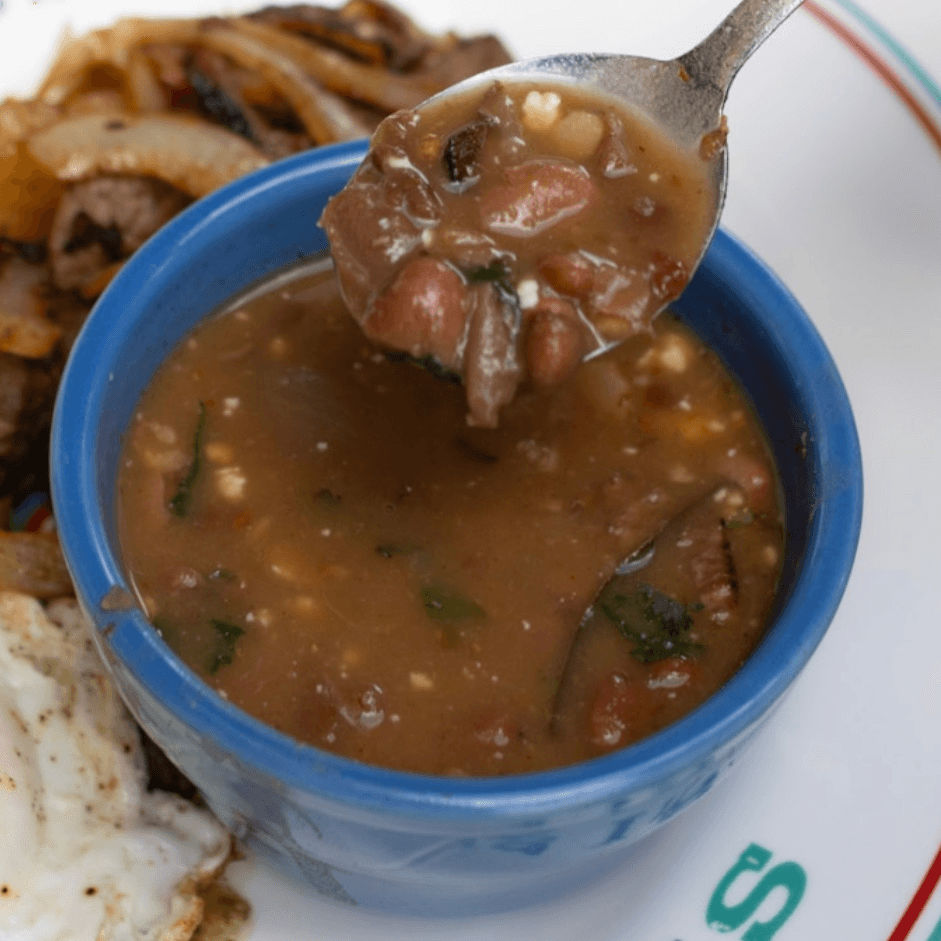 fajita steak, grilled onions, two eggs, cheese, avocado, pico, rice, bean soup