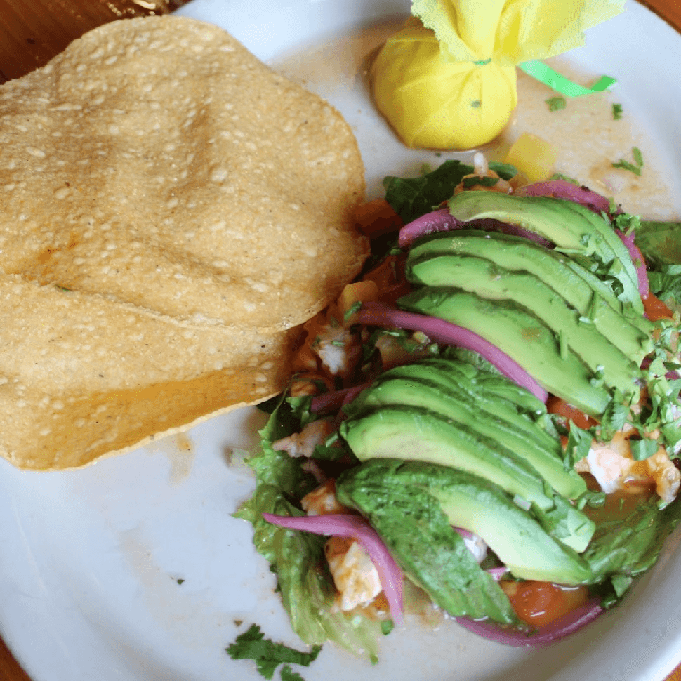 marinated fish and/or shrimp with tomatoes, onions, avocados, pineapple