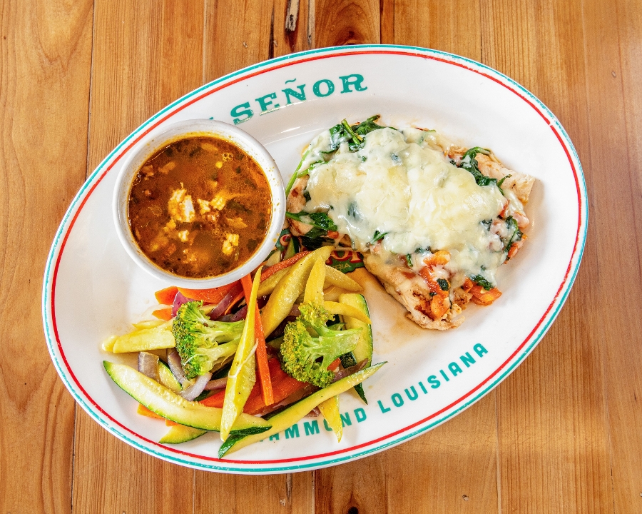 chicken breast, sauteed spinach, mushrooms, cheese,veggies, bean soup