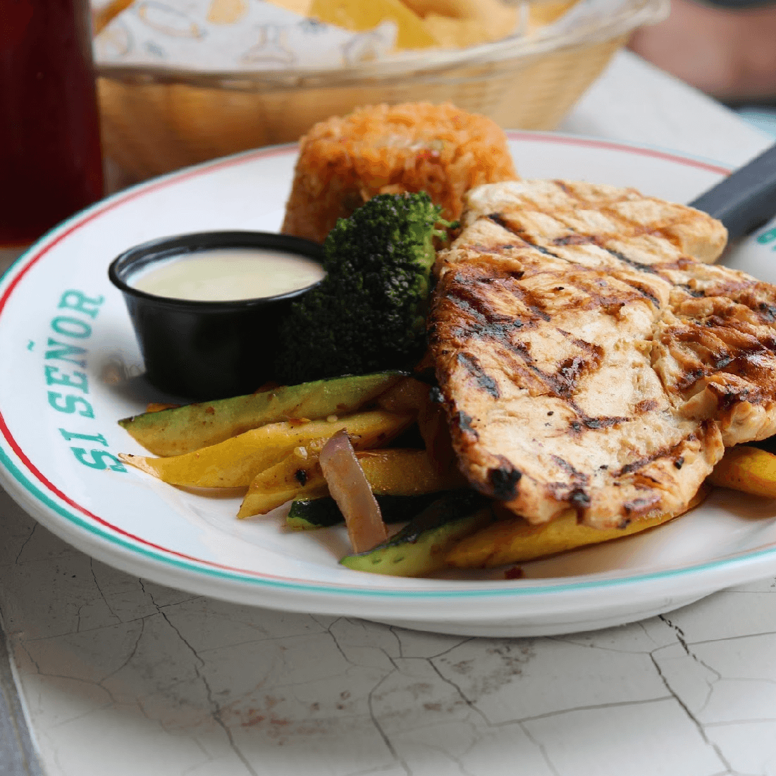 rice with grilled chicken, queso on top